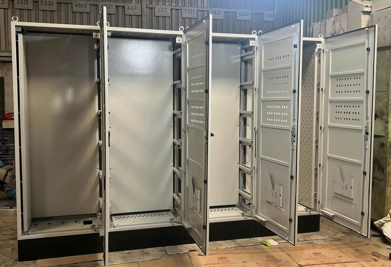 Làm chân tủ, bố trí tủ điện trong nhà xưởng ở khu vực thích hợp. Thiết lập hàng rào bảo vệ hoặc biển cảnh báo và đưa vào vận hành.